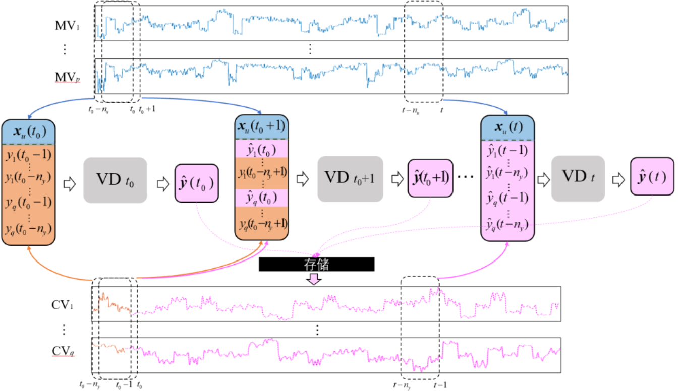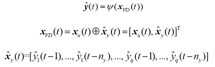在神經網絡訓練過程中,模型的輸入由實際采樣數據組成。這種模型被大多數基于深度學習的非線性系統(tǒng)辨識方法所使用。然而,為了模擬被控對象對控制信號的響應,希望在訓練結束后構建一個只使用CV的實際初始條件和MV的實際值作為輸入的模型。該模型可以作為虛擬裝置模擬受控對象在不同工況下的動態(tài)響應或測試控制算法的性能,更適合控制領域。因此,模型的輸入向量由實際輸入和預測輸出組成,而不是實際輸入和實際輸出,如下式所示。