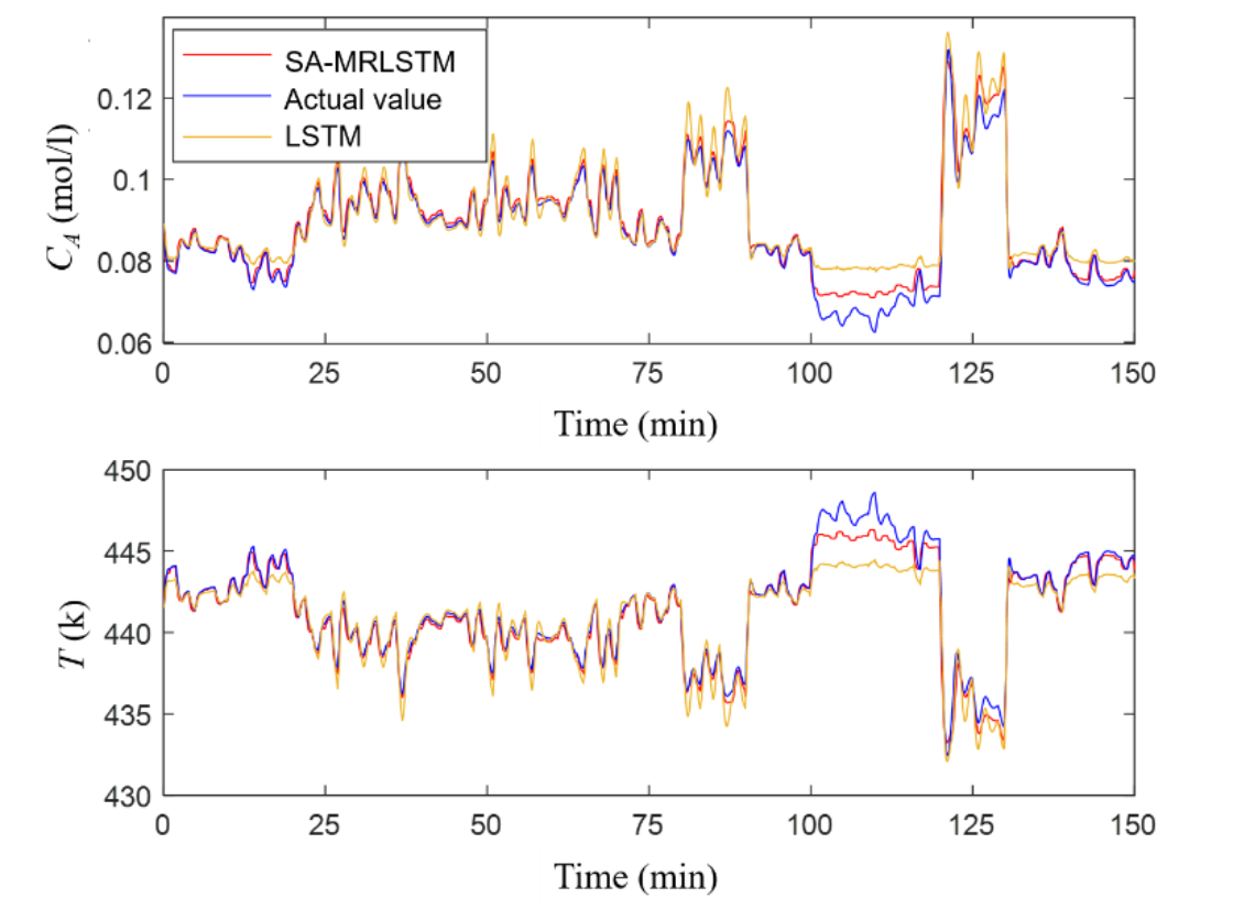 考慮到化學過程的復雜性和傳統(tǒng)辨識方法的局限性,本文提出了一種基于SA-MRLSTM的結合機理和過程數據的化工過程動態(tài)模型辨識方法。為了在訓練數據的信息不充分時獲得準確的模型,引入微分方程作為正則化項來約束神經網絡的輸出,迫使網絡滿足微分方程描述的物理或化學機理。在訓練過程中,將自適應權值引入損失函數,通過最小化損失和最大化自適應權值來訓練神經網絡,以獲得更好的擬合結果。此外,還討論了當機理方程中存在未知參數時,神經網絡的訓練和參數估計方法。VD模型使用初始條件和MV作為模型輸入,可以有效地獲得先進控制器所需的傳遞函數模型,避免辨識實驗對實際生產過程的干擾。在pH中和與CSTR過程上的實驗結果表明,SA-MRLSTM網絡適用于化工過程辨識,具有較強的魯棒性和泛化能力。