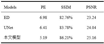 由于電成像測井無法獲取完整全井眼數據,無法對空白帶填充后的電成像的整體填充效果進行量化評價,因此本文首先對人為添加條形掩膜的自然場景灰度圖像進行缺失值填充實驗確保填充模型有效。本文將所提模型與編碼器解碼器模型(Encoder-Decoder,ED)與UNet進行對比分析,客觀指標的量化結果如表1所示。相比UNet模型,本文所提模型的PE減少了19.03%,SSIM提升了2.9%, PSNR提升了4.66%,說明特征融合大幅度提升了相應的客觀指標,驗證了本文所提空白帶填充模型的有效性。