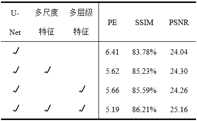 本文分別去除多尺度特征模塊與多層級特征模塊進行消融實驗。通過表2中的客觀指標可以看出,去除單個特征模塊后各類評價指標均會存在不同程度的降低,驗證了本文所提多尺度與多層級特征模塊的有效性。