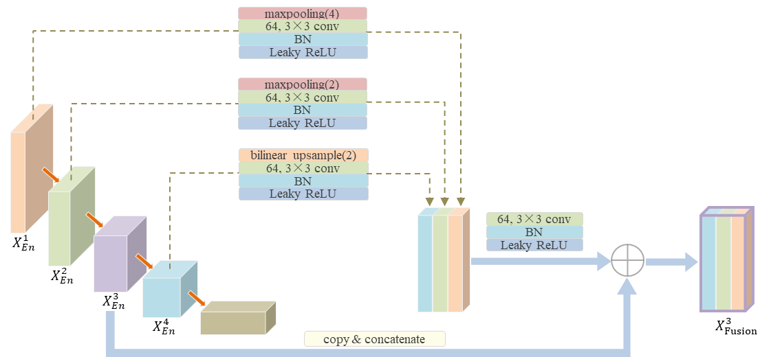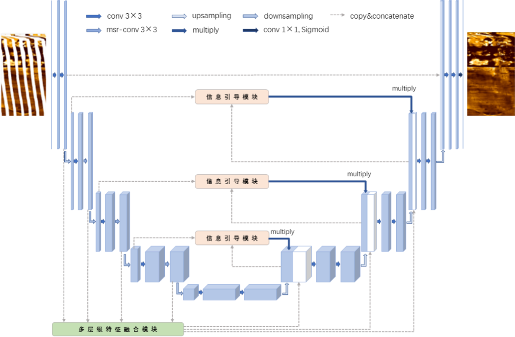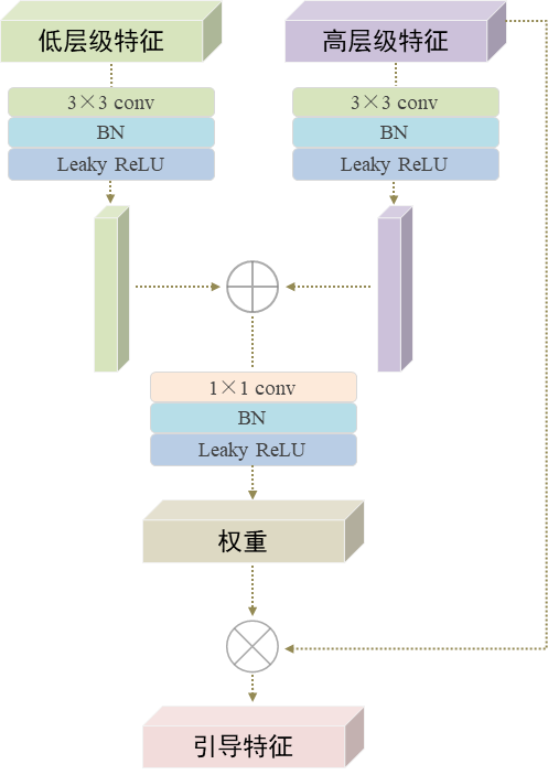 同時,在編解碼特征連接環節引入多層級編碼特征融合模塊與信息引導模塊,豐富上采樣的特征尺度,減少解碼過程中的信息丟失,具體細節如圖6和圖7所示。