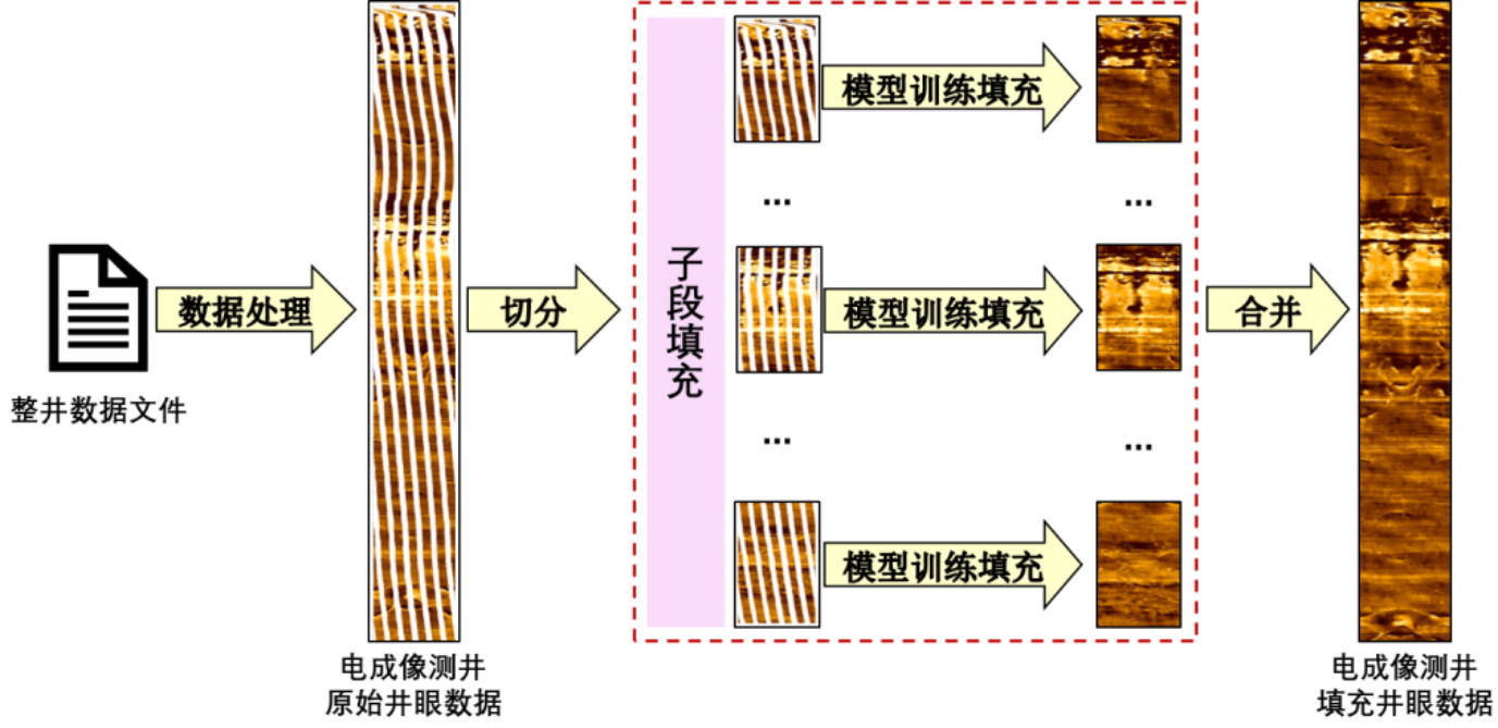 微電阻率成像測井測得的電阻率數據經過色標刻度標定后得到能夠反映地層井壁巖石結構、裂縫等地質特征的二維圖像,可為儲層評價、巖性識別、油藏裂縫識別等提供重要研究依據。由于完全覆蓋井眼的成本很高,導致電阻率數據存在空白區域,這增加了數據解釋的難度。因此,開展空白帶區域的填充工作對于精確解釋儲層信息至關重要。目前,基于深度學習的空白帶填充算法面臨兩個主要問題:1)大部分算法通常采用二維井壁圖像作為填充修復的主體,但當色標或比例尺發生變化時,填充結果可能不再適用,存在魯棒性不足的問題;2)其次,基于圖像的填充結果無法導入現有的測井數據分析軟件中對地層進行深入分析,在實際應用中存在局限性。為了克服這些問題,本文提出一種基于特征融合的微電阻率成像測井空白帶無監督填充方法,本文以測井所得電阻率數據作為填充修復主體,填充后的結果能夠導入測井數據分析軟件,貼合實際生產場景。此外,本文通過融合不同尺度特征,能夠有效改善空白帶填充的紋理細節與邊緣層理連續性,從而提高測井數據的整體質量和解釋的準確性。