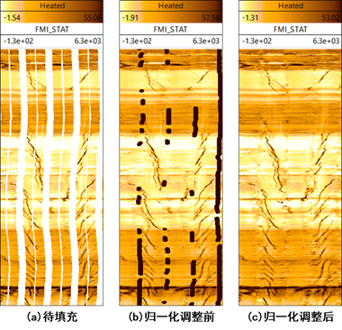 為避免離群值影響,本文調整了輸入模型的電阻率數據的歸一化方式,調整后空白帶填充效果得到極大改善。調整前后填充結果如圖9所示。