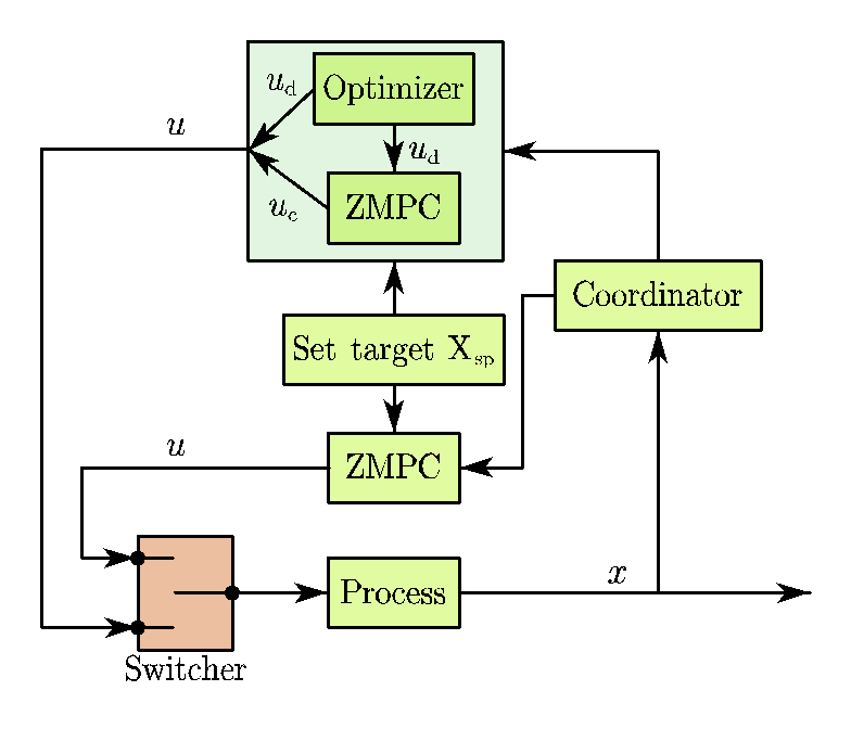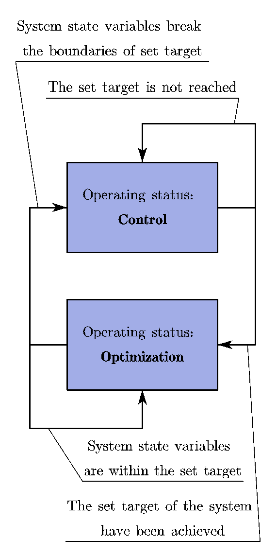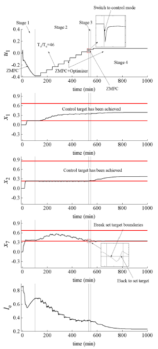 本文以能源與經濟優化為目的,提出了一種基于冗余控制變量的優化策略。該策略能夠被使用在區間控制的框架下。當系統在設置區域之外時,由區域預測控制器進行控制,以便系統可以快速進入設定目標。當控制器進入設定目標的內部時,意味著控制目標已經實現,產品質量已經滿足需求。此時,可以優化系統的經濟性能。 盡管經濟優化通常與控制性能不兼容,但在區間控制的框架下可以利用其潛在的自由度協調這兩種關系。系統的外部干擾等因素可能會打破這種優化與控制共存的狀態。在這種情況下,控制策略應當及時切換以免產品質量受到影響。整個系統將處于這種動態平衡過程中。