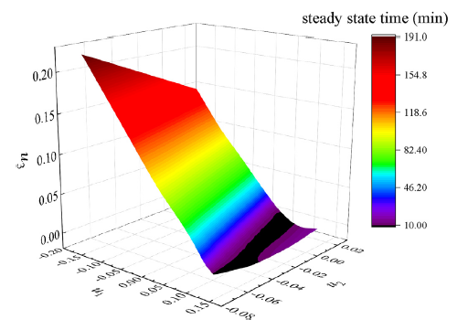 圖3.系統離線仿真圖(每個點都是穩態工作點,以及從初始時刻到穩態工作點的時間)。
