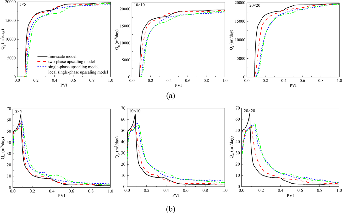 以圖1所示的滲透率場及井眼軌跡模型為例,對(duì)該模型分別按升尺度倍數(shù) 5×5、10×10 和 20×20 進(jìn)行尺度升級(jí)計(jì)算。圖2展示了不同升尺度倍數(shù)下細(xì)尺度模型與粗尺度模型的結(jié)果對(duì)比。結(jié)果表明,本文提出的尺度升級(jí)算法(紅色虛線)在各個(gè)尺度下均與細(xì)尺度模型結(jié)果(黑色實(shí)線)最為接近,展現(xiàn)出較高的準(zhǔn)確性。其中,局部單相尺度升級(jí)模型(綠色點(diǎn)劃線)為某商業(yè)軟件采用的尺度升級(jí)算法,本文提出的算法明顯比該商業(yè)軟件方案更為準(zhǔn)確。