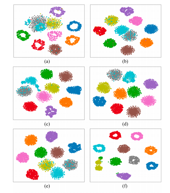 圖2 不同方法所學特征的t-SNE可視化效果. (a) MAML. (b) RN. (c) PN. (d) CLPN. (e) MLCTL.(f) MLIIO.