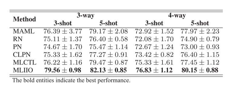 為驗證所提方法的有效性,在公開CWRU軸承數據集上對比了多種代表性方法(MAML、RN、PN、CLPN和MLCTL),結果表明所提出的元學習方法在小樣本故障診斷的平均診斷精度方面更加出色。在3-way 5-shot設置下,所有方法的平均診斷準確率超過了90%,這表明即使在樣本數量有限的情況下,MLIIO方法也能學習到有效的特征表示。在其他設置下,平均準確率也大多在80%到90%之間,顯示了該方法在少樣本學習問題上的魯棒性。