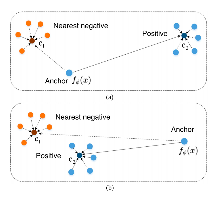 如上圖所示,上圖a中,錨點樣本與其對應的正樣本之間的距離比最近的負樣本之間的距離更近,這種情況是容易處理的情況。但是在圖b中,盡管與正樣本之間的距離更近,但是距離卻很遠這種情況下,模型可能難以準確學習到類別之間的區分邊界,因為錨點樣本的特征表示可能不如其類別原型那樣具有代表性。因此,本文提出MILO方法,結合IAL和IDL兩個關鍵損失函數優化模型的訓練過程,最終學習到一個具有更好泛化性的模型。