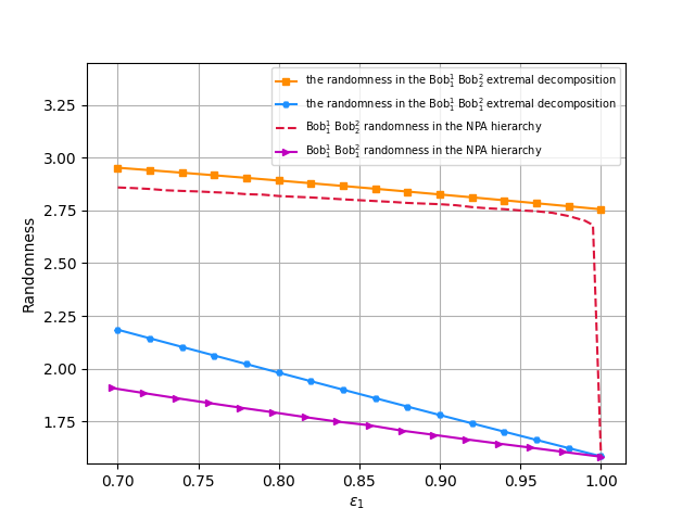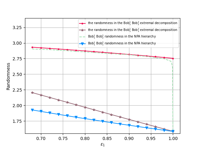 在設備可信方案中,我們利用上述隨機性的定義以及給出的特殊POVM分解形式量化了最大糾纏態和最大違背態的隨機性,在設備無關方案中,使用半正定規劃方法序列NPA層級約束量化了其中的隨機性。