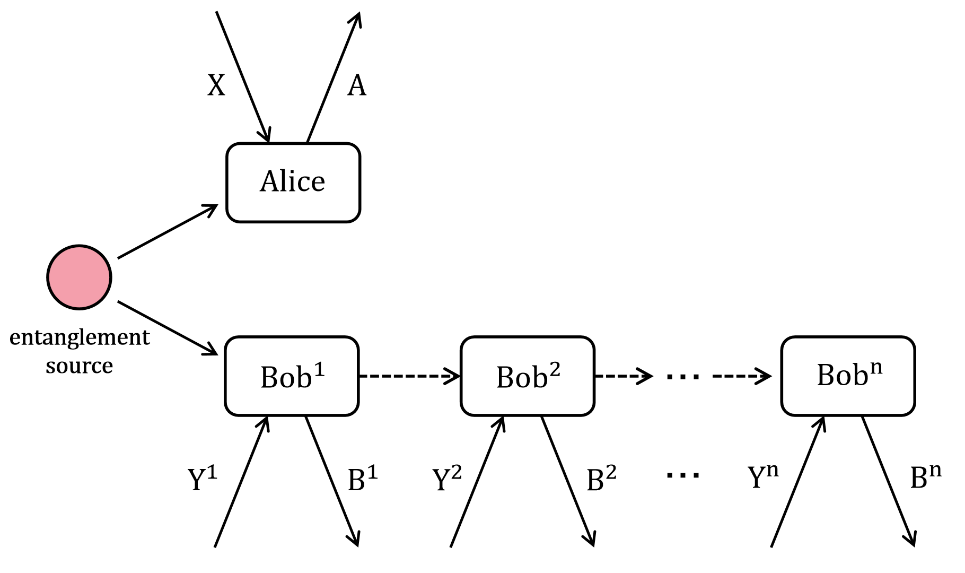 本文主要考慮了單邊序列測量下隨機性的定義,該模型已被廣泛提出并用于研究序列測量之間的非局域共享。我們根據監聽者Eve和量子設備之間不同關聯程度,推導得到了監聽者Eve的經典最大猜測概率和量子最大猜測概率,然后使用條件最小熵刻畫其中的隨機性。首先在序列測量方案下建立了量子內在隨機性的定義,包括不可信量子態、不可信序列POVM以及不可信量子態和測量場景。然后,利用本文對序列測量隨機性的定義以及序列NPA半正定規劃方法,量化了三維最大糾纏態和最大違背態在設備可信和不可信場景中產生的內在隨機性。此外本文對隨機性的定義不限于每一個Bob是獨立的,還可以擴展到允許經典信號傳輸的場景。
