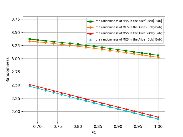 圖中展示了最大違背態與最大糾纏態之間全局內在隨機性的比較。從圖中可以看出,隨著Bob方弱測量系數的增大,越接近投影測量時產生的隨機性越小。結果表明,在序列CGLMP測量場景中,與最大糾纏態相比,最大違背態展示出了更大的隨機性。