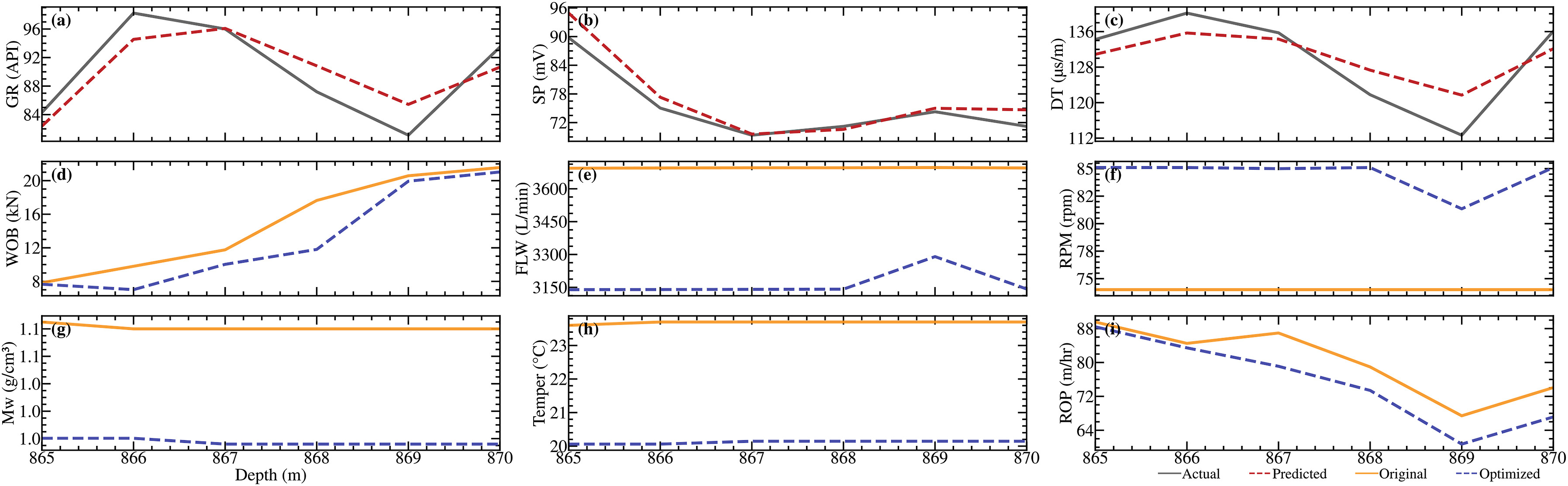 圖5(a)–5(c)顯示 GR、SP 和 DT 顯著降低,表明鉆遇較軟地層。這些地質特征表明地層的強度和密度較低,這通常需要調整鉆井參數以適應地層特征。在此類地層中,優化的鉆井參數包括:降低 WOB、降低 FLW、提高 RPM 以及降低 MwIN 和 TemIN。圖5(d)–5(f) 說明了這些調整的效果。降低 WOB 有助于減少對較軟地層的過大壓力,防止鉆頭快速磨損,同時保持良好的切削效率。降低泵流速可最大限度地減少井壁的侵蝕,同時保持鉆井液的有效循環。提高 RPM 可以提高鉆頭的切削速度,以適應較軟的地層特性。降低泥漿密度和溫度有助于減少對井壁的壓力,保持泥漿性能,并減少對鉆頭的熱影響。上述調整反映了 DPODDPG 算法在優化較軟地層鉆井參數、提升鉆井過程穩定性和效率方面的有效性。