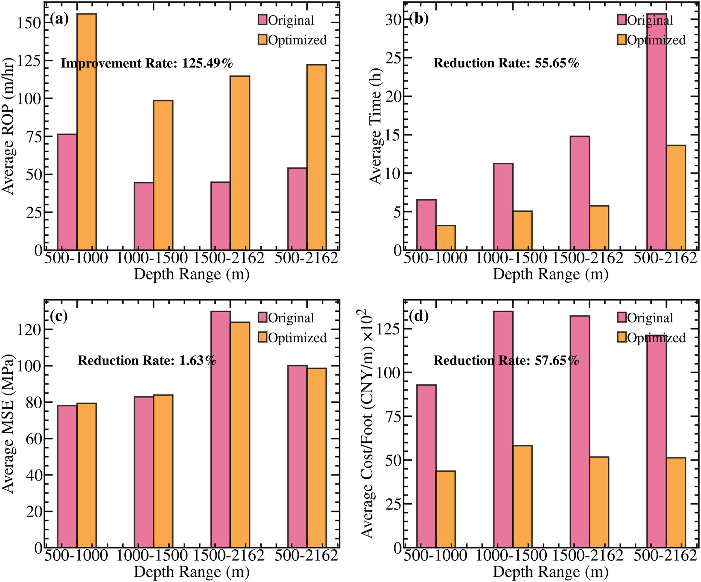 本文提出了一個多目標鉆井參數優化框架,結合符號回歸、時間序列網絡和馬爾可夫決策過程,以精確預測鉆進速度、地層條件,并實時優化鉆井參數。包括用于構建經驗方程的多群體進化符號回歸算法、用于數據預處理的變分模態分解和樣本熵的集成,以及用于提高預測準確性的多頭自注意力時間序列網絡。分位數回歸進一步估計鉆取參數調整的范圍。此外,還開發了一種鉆井參數優化深度確定性策略梯度算法來自動進行實時參數調整。對南海樂東10-1 區塊的實證分析表明,鉆井速度顯著改善:ROP 從 54.18 m/hr 增加到 122.17 m/hr,機械比能從 100.82 MPa 下降到 97.78 MPa,每英尺成本從 121.16 × 102 CNY /m 降低到 51.31 × 102 CNY/m。
