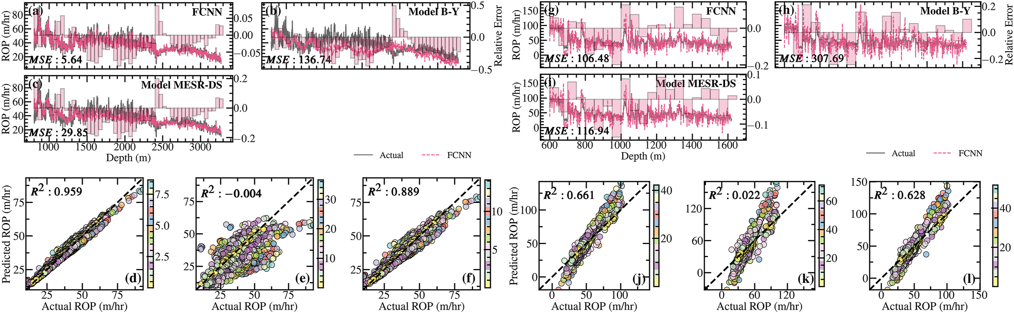 圖 2 比較了 FCNN 模型與兩種ROP 方程在訓練井和鄰井中的性能。結果顯示,FCNN 模型在訓練井中取得了最低的 MSE和最高的 R2,優于高復雜度的 MESR-DS 方程和經典的 Bourgoyne-Young 方程。這表明 FCNN 模型在準確性和數據擬合方面具有顯著優勢。盡管高復雜度 MESR-DS 方程未達到 FCNN 模型的性能,但在捕捉地質變異性方面明顯優于 Bourgoyne-Young 方程,后者因固定的參數設置而限制了對新地質條件的適應性。在預測鄰井的 ROP 時,FCNN 模型和高復雜度 MESR-DS 方程的 MSE 值顯著低于 Bourgoyne-Young 方程的 MSE 值。這表明高復雜度的經驗方程在泛化能力上與機器學習方法近似。