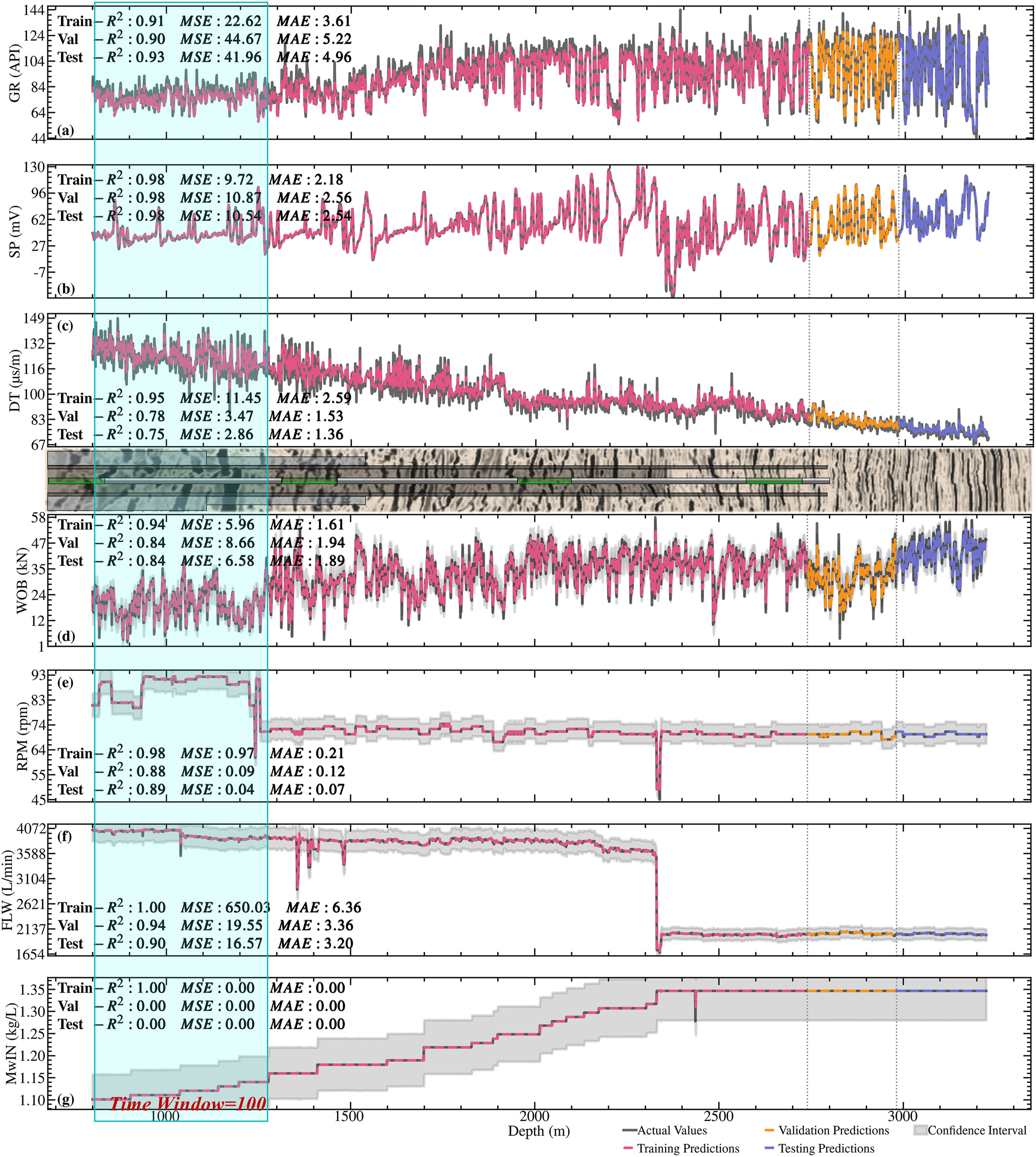使用VMD-CNN-BiLSTM-MA 模型預測關鍵測井參數,此外,引入分位數回歸方法和分位數損失函數構建CNN-BiLSTM-MA-QA模型,用以預測關鍵鉆井參數潛在調整范圍,增強實時決策的適應性和響應性。使用南海樂東 10-1 區塊的某口井現場數據,評估了 VMD-CNN-BiLSTM-MA 和 CNN-BiLSTM-MA-QA 模型在預測關鍵隨鉆測井參數(GR、SP 和 DT)以及鉆井參數(WOB、RPM、FLW、MwIN和 TemIN)方面的有效性。如圖3所示的預測結果提供了兩種模型性能的直觀比較,突出了它們在實際鉆井環境中的能力。