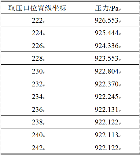 最后,以噴嘴入口直徑32mm,噴嘴直徑12mm為例進(jìn)行數(shù)值模擬研究,邊界條件設(shè)置為速度入口、壓力出口,CO2流體從噴嘴上方流入、下方流出,CO2流量設(shè)置為300t/d,對(duì)取壓口位置進(jìn)行優(yōu)化。根據(jù)模擬結(jié)果,噴嘴上游直管段內(nèi)的壓力分布和速度分布比較均勻,上游取壓口位于距噴嘴入口1d處即可滿足取壓要求。選取噴嘴下游取壓口位置時(shí),由于噴嘴下游直管段內(nèi)產(chǎn)生渦流,為獲得穩(wěn)定差壓,下游取壓口位置應(yīng)選擇在腔內(nèi)壓力相對(duì)穩(wěn)定的地方,下游直管段不同取壓位置的壓力數(shù)據(jù)如表1所示,由表可知:下游取壓口縱坐標(biāo)位置為222~230mm壓力降低較明顯,從232mm開始?jí)毫档洼^少幾乎持平,考慮到噴嘴流量計(jì)實(shí)際安裝尺寸,流量計(jì)不宜過長,因此下游取壓口位置應(yīng)選在232mm處即距離噴嘴出口2d位置處。
