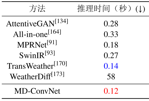 同時,進(jìn)行了實驗對不同恢復(fù)方法的推理時間進(jìn)行比較分析,如下表所示。在所有方法的測試實驗中,統(tǒng)一采用相同的輸入圖像尺寸256x256。值得注意的是,MD-ConvNet具有最快的推理速度,每張圖像僅需0.12秒就可以完成圖像恢復(fù)。僅基于卷積的模型架構(gòu)成為提高其效率的關(guān)鍵因素,并且采用多尺度和編碼器-解碼器的設(shè)計進(jìn)一步提升特征豐富度和利用率,從而達(dá)到基于較大參數(shù)模型Transformer和擴散模型相同的實驗性能。