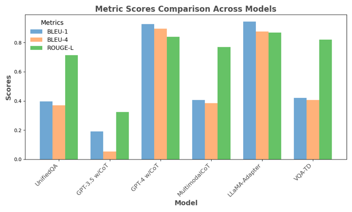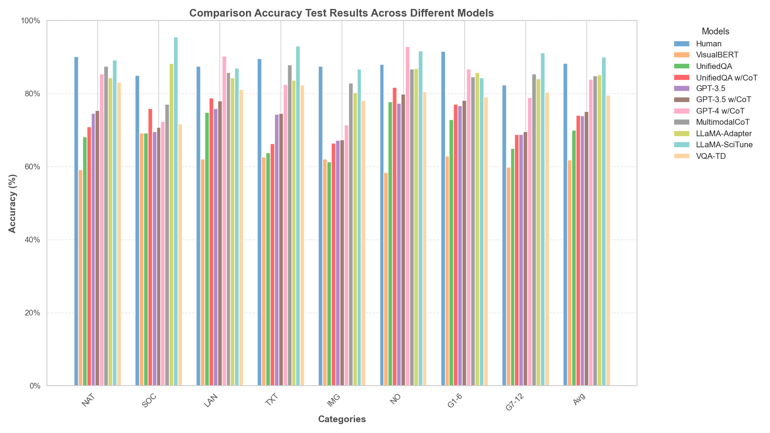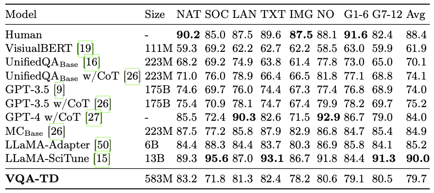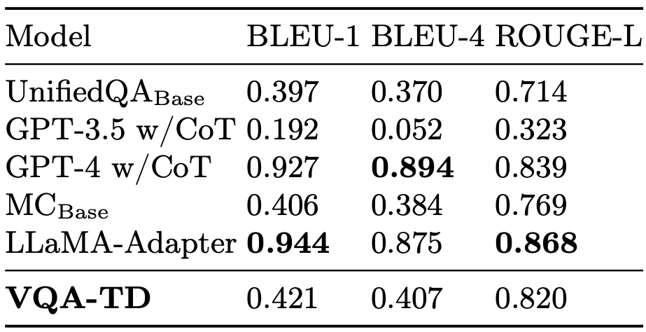 在ScienceQA數(shù)據(jù)集上的對(duì)比實(shí)驗(yàn)表明,VQA-TD以GPT-3.5的1%參數(shù)量,在答案準(zhǔn)確率和解釋文本生成質(zhì)量上超過GPT-3.5;在部分任務(wù)上接近或超越Llama以及GPT-4。