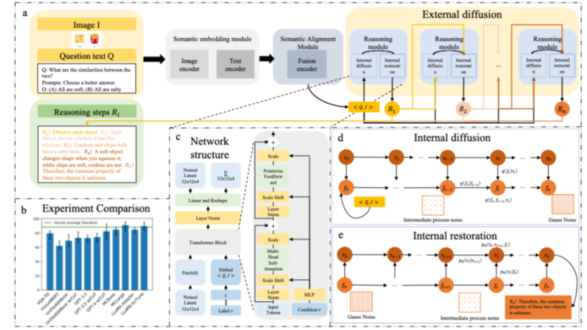 在復(fù)雜視覺問答場(chǎng)景下,由于問題與答案之間的語義距離較遠(yuǎn),vc僅針對(duì)最終生成的答案作解釋,并不能有效縮短問題與答案之間的語義距離。為緩解此語義偏差問題,本文提出一種擴(kuò)散思維鏈模型(VQA-TD)來實(shí)現(xiàn)視覺問答的推理過程。該模型由內(nèi)外部?jī)蓴U(kuò)散過程組成,其中外部擴(kuò)散過程用來生成每步推理的解釋;內(nèi)部擴(kuò)散過程用來描述問題向每步解釋遷移的概率。通過在ScienceQA數(shù)據(jù)集上的實(shí)驗(yàn)表明,該擴(kuò)散思維鏈模型以GPT3.5的1%參數(shù)量,在答案準(zhǔn)確率和解釋文本生成質(zhì)量上全面超過GPT-3.5;在部分子任務(wù)上,已接近或超過GPT-4、Llama等模型。
