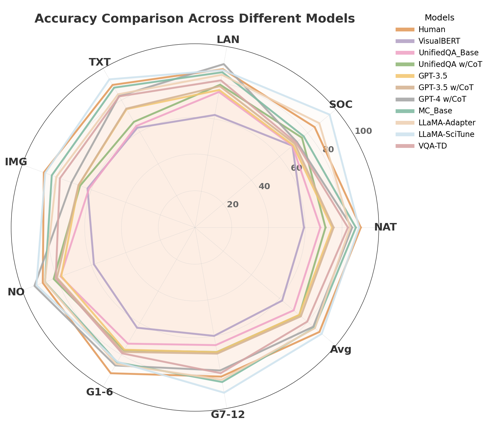 表1 對(duì)比試驗(yàn)結(jié)果(NAT:自然科學(xué);SOC:社會(huì)科學(xué);LAN:語言科學(xué);TXT:文本提示;IMG:圖像提示;NO:無提示;G1-6:1-6年級(jí)題目;G7-12:7-12年級(jí)題目)