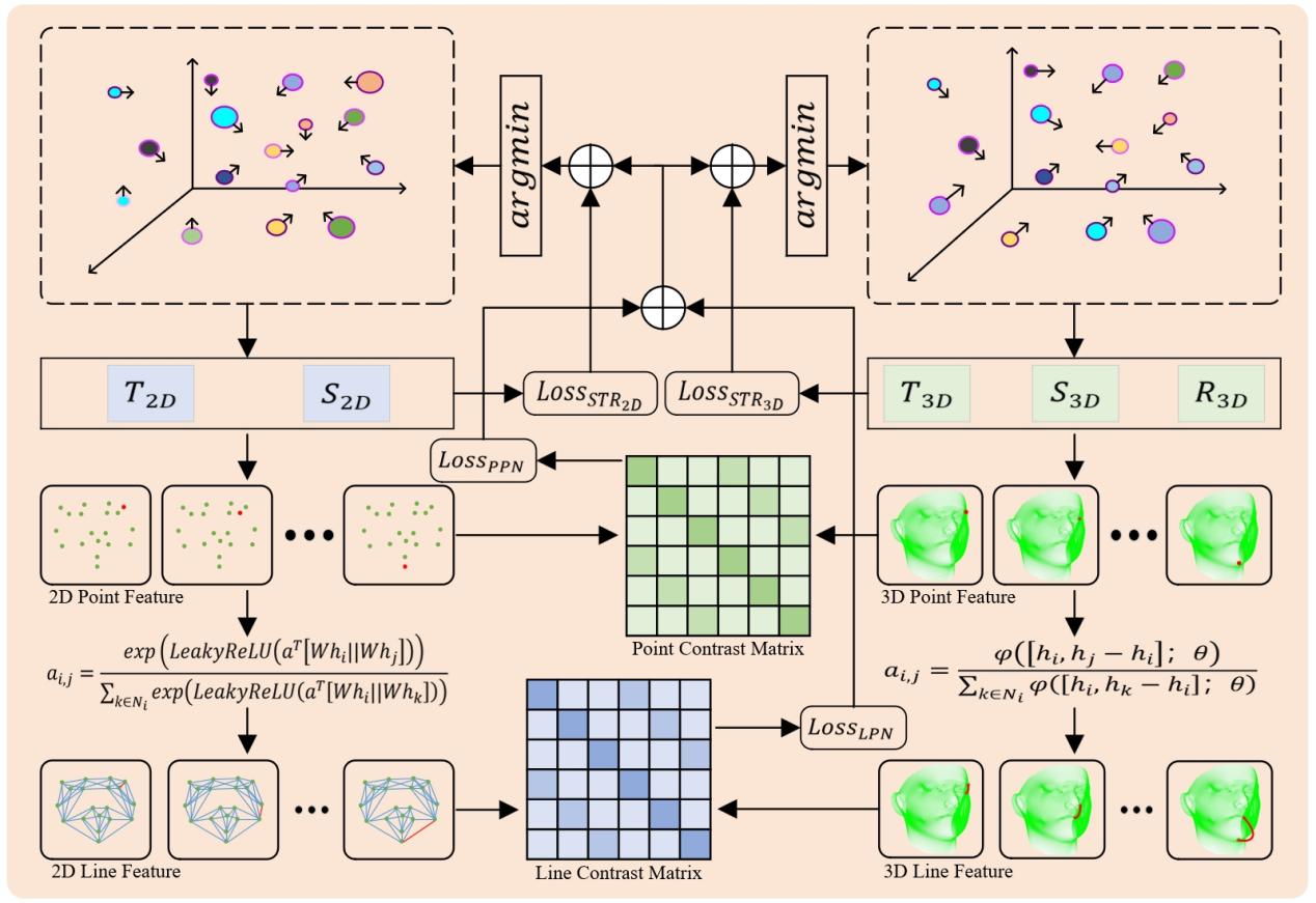 本文提出了一種新的具有區域和差分感知機制的特征金字塔網絡,從RGB人臉圖像中檢測二維關鍵點,以提供平面信息,進而提高三維人臉重建的質量。在此基礎上,構建粒子群優化的對比學習,通過二維和三維關鍵點的交替匹配,實現跨模態關鍵點重定位,將粒子群優化的全局搜索能力與對比學習的局部特征交互能力相結合,獲得魯棒結果。最后,提出了二階雙線性注意圖卷積來糾纏多模態特征,利用多模態信息的互補性來增強面臉關鍵點的幾何分布與頭部姿態角度之間關系的探索能力。