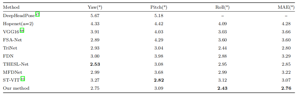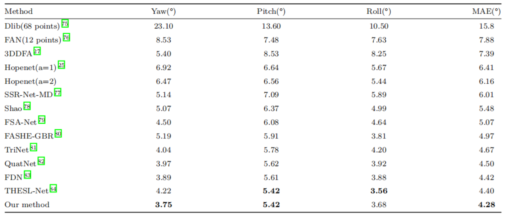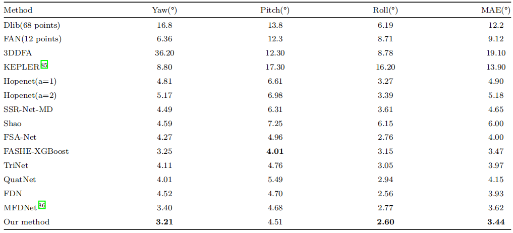 為了定量地評估我們的方法的準確性,表1和表2顯示了最先進的方法和我們的方法與AFLW2000和BIWI數據集的MAE。粗體表示每一列中的最小值。結果表明,我們建立的關鍵點和頭部姿態之間的非線性關系更穩健。在BIWI-train數據集上重新訓練該模型,并在BIWI-test數據集上進行測試。實驗結果見表3,表明所提模型的性能最優。可以看到,本文模型在所有數據集上都達到了最低的總體MAE,并且在單個數據集上也表現良好。