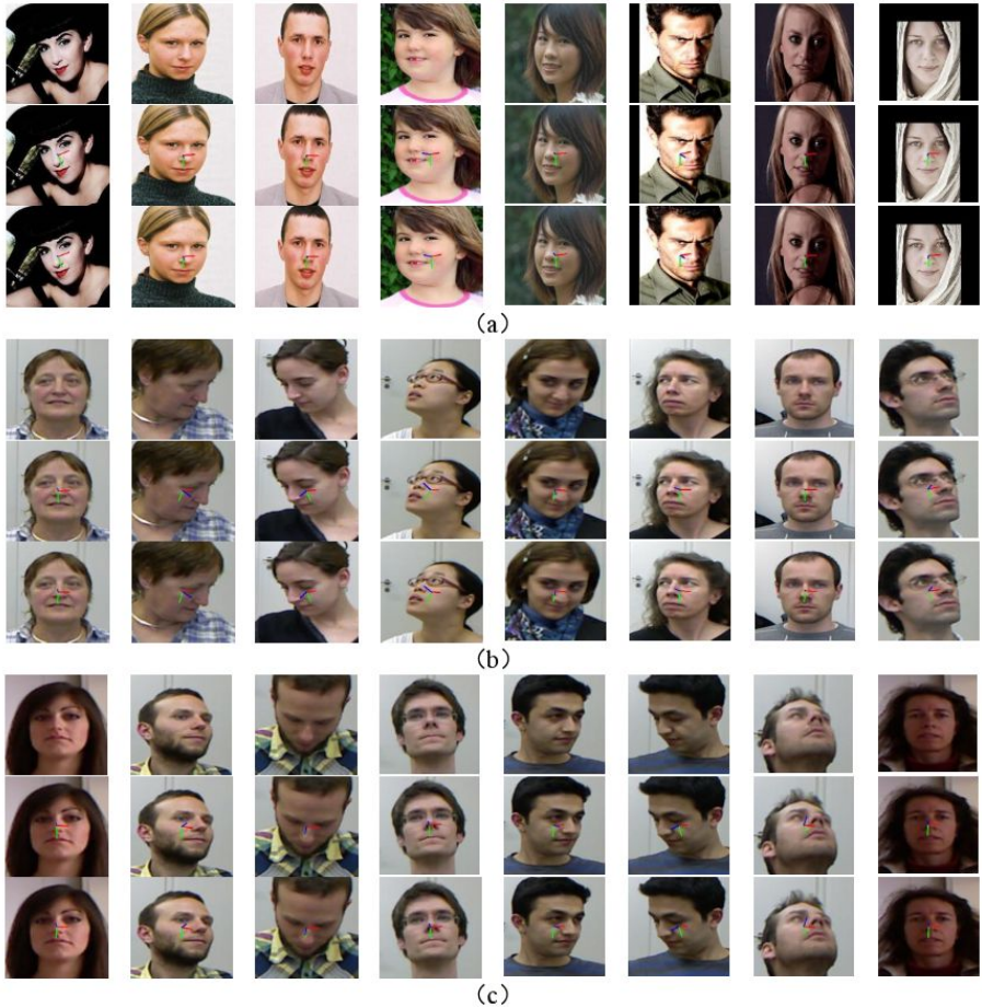 圖5顯示了不同方法在AFLW20002000、BIWI和BIWI-test數據集上的結果。可以看出,本文模型能夠合理地估計各種頭部姿態。