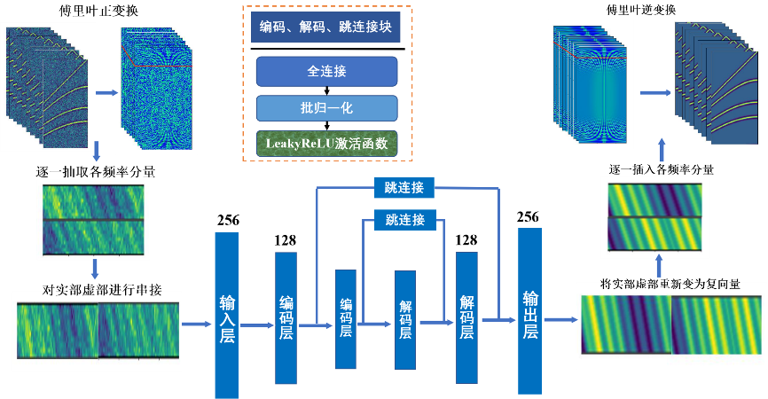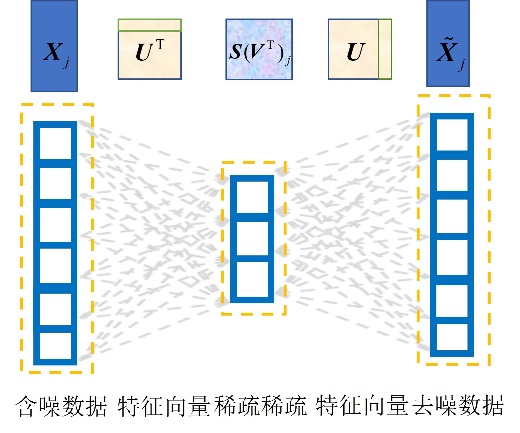 基于上述自編碼網絡去噪原理,設計了無監督網絡模型,如圖2所示,利用SVD分解后特征值能量占比為90%時對應的階數,作為中間層維度的參考。此策略保證自編碼網絡的稀疏度低于SVD方法,能學習到更稀疏的數據特征。