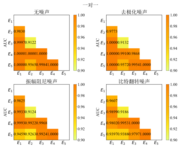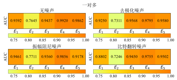 針對(duì)一對(duì)一和一對(duì)多模型的數(shù)值模擬實(shí)驗(yàn)結(jié)果呈現(xiàn)在圖3和圖4中。對(duì)于一對(duì)一模型,在許多情況下,AUC大于0.95,有些情況甚至達(dá)到了1.0,表明方法有著極高的分類性能。對(duì)于一對(duì)多模型,與一對(duì)一模型相比,準(zhǔn)確度略有下降,可能是因?yàn)榭紤]了更多的分類。然而,分類準(zhǔn)確度仍然相當(dāng)可觀。
