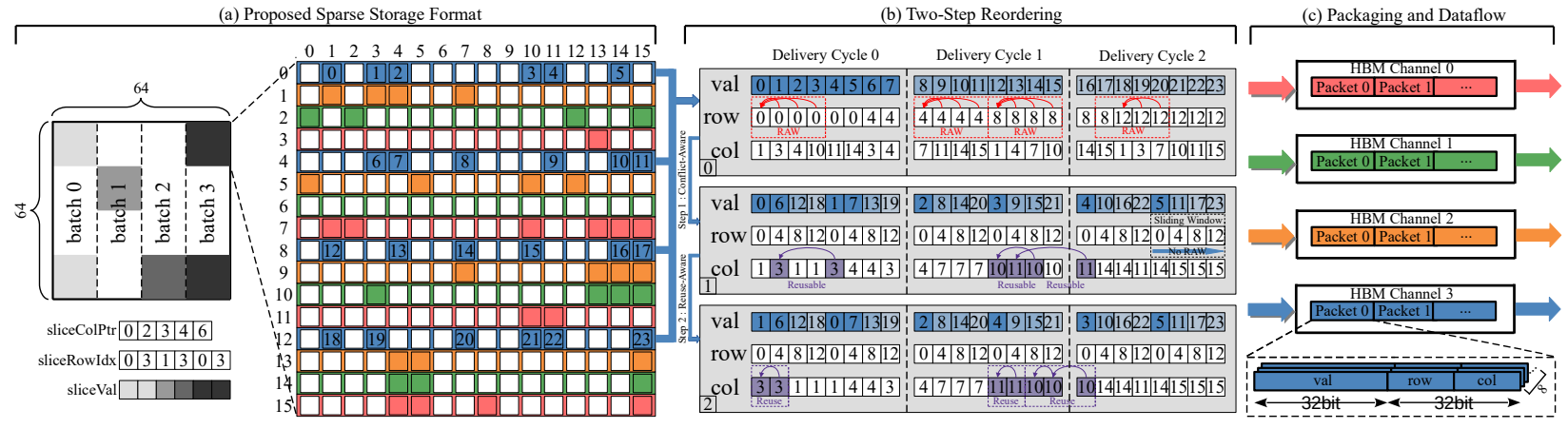 圖 1:稀疏存儲格式、兩步重排序算法和數(shù)據(jù)流處理方案