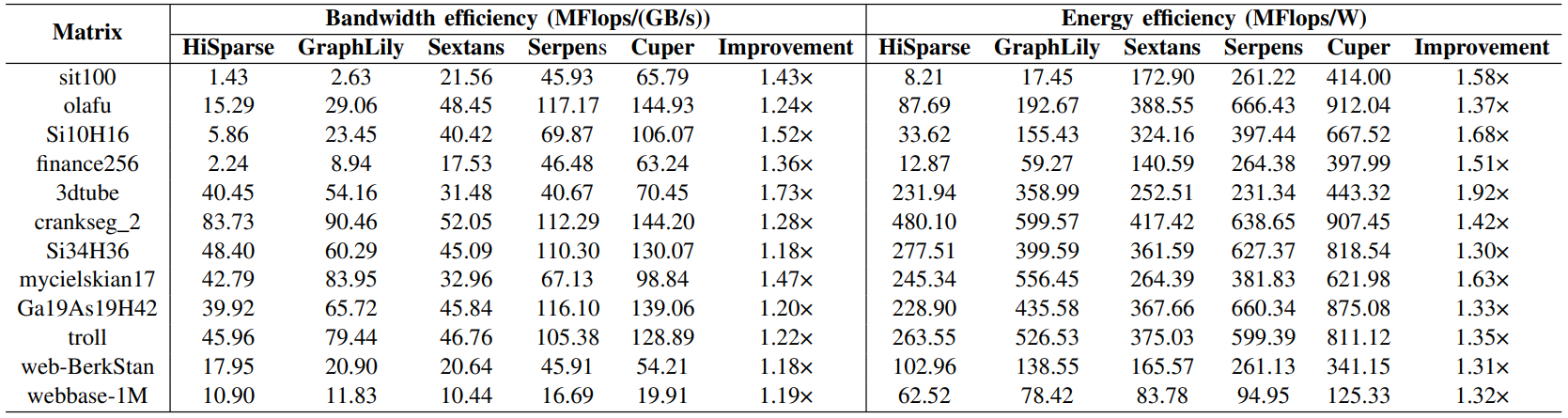 Cuper的幾何平均吞吐量分別比最新的SpMV加速器HiSparse、GraphLily、Sextans和Serpens高出3.28倍、1.99倍、1.75倍和1.44倍。此外,幾何平均帶寬效率分別提高了3.28倍、2.20倍、2.82倍和1.31倍,而幾何平均能效則分別優(yōu)化了3.59倍、2.08倍、2.21倍和1.44倍。