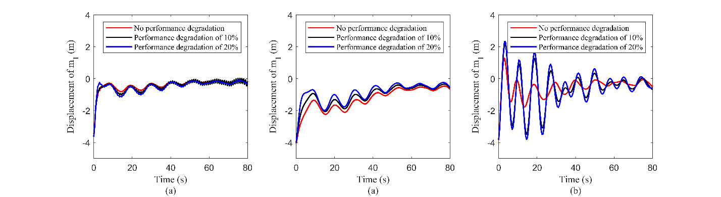 圖3 不同程度參數(shù)不確定情況下質(zhì)量塊一RVC、DRHGPC與LQR控制效果對比