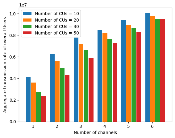 圖二顯示了CU數量和信道數量對用戶總傳輸速率的影響。