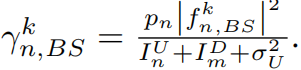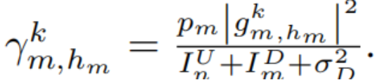根據上述描述,多個請求用戶可以與選擇k信道的原始蜂窩用戶來重用同一信道。蜂窩用戶在基站側的信干燥比(SINR)為: