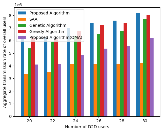 圖四顯示了D2D用戶數量與全部用戶總傳輸速率的關系,也對比了五種算法的性能。