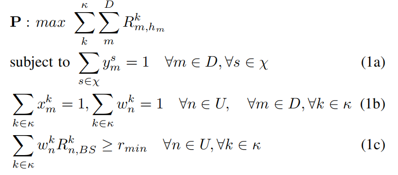 其中,條件(1a)表示每個D2D用戶只能選擇一個合作者進行連接,條件(1b)表示每個CU或每個D2D用戶只能選擇一個信道進行傳輸。約束條件 (1c) 限制了最小數據傳輸速率。