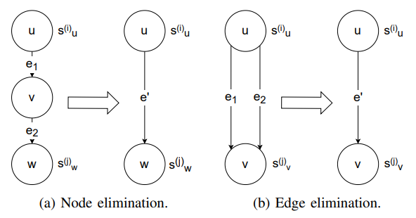 為求解該問題,本文提出節點消除和邊消除技術簡化原計算圖,如圖1所示。