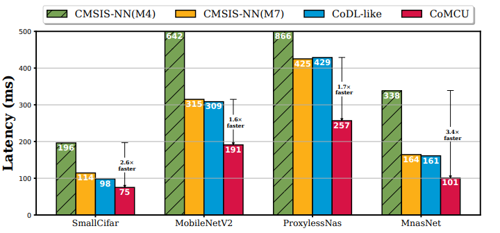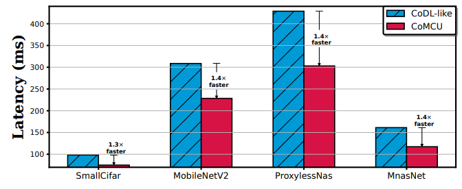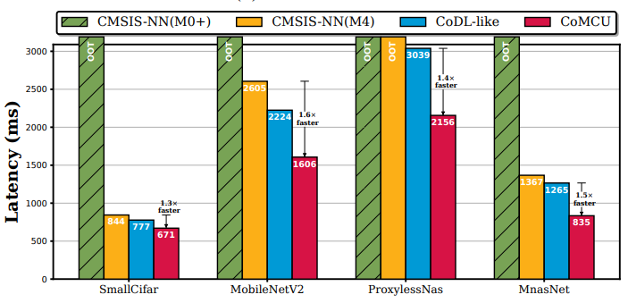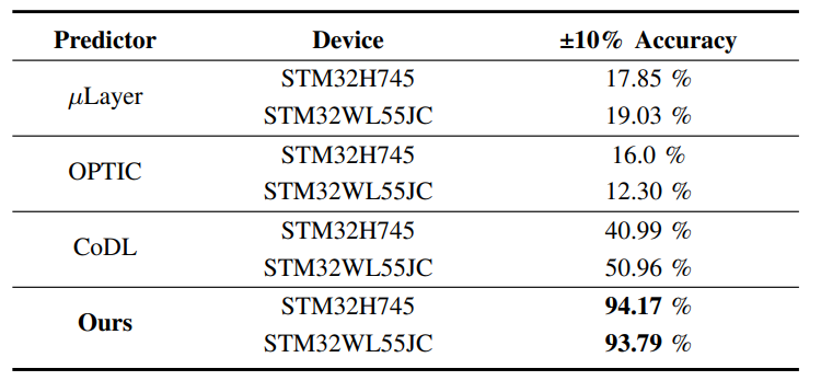 最后,我們評估了CoMCU的延遲預測模型的性能,如上圖所示。由于該延遲預測模型考慮了MMCU的平臺特性,因此能夠實現93%以上的準確率。