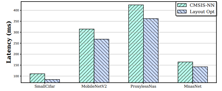分別代表算子可能的最大布局數和 IOP 策略數。實驗評估結果表明,我們的調度計劃能為 CMSIS-NN(一種先進的邊緣推理軟件棧)實現1.52倍至3.37倍的加速。此外,與最先進的 IOP 執行系統相比,我們的調度計劃大約實現了1.67倍的加速。