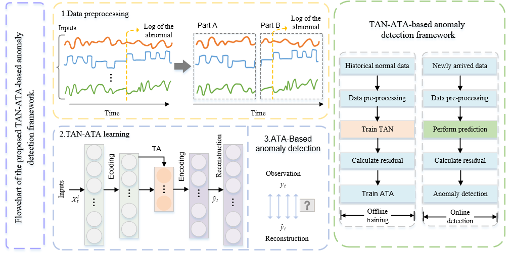TAN-ATA方法的總體框架如圖2所示,該方法包括三個階段:數據預處理,TAN-ATA學習,以及基于ATA的異常檢測。特別的,TA機制集成到時序模型體系結構中以創建TAN。此外,提出了一種自適應閾值策略ATA,用于ESP異常檢測。在線測量階段,將新樣本輸入TAN-ATA,實時獲取當前異常情況。