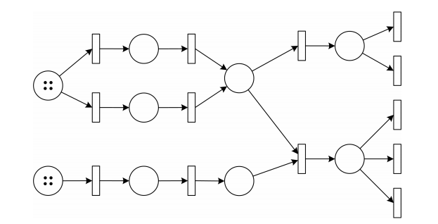 模型組成的基本思想是根據(jù)任務(wù)卸載模式將邊緣模型“拼接”到云模型上。將邊緣服務(wù)器的SPN模型中的“輸出”位置拼接到云模型的“輸入”位置。服務(wù)可以動(dòng)態(tài)組合,服務(wù)選擇可能發(fā)生在選擇部署在云服務(wù)器上的適當(dāng)服務(wù),因此,來(lái)自邊緣站點(diǎn)的請(qǐng)求可以被調(diào)度到特定的云服務(wù)器,得到一個(gè)最佳策略。圖中展示了復(fù)合模型的示例: