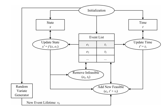 在現(xiàn)實(shí)中,邊緣計(jì)算系統(tǒng)的規(guī)模可能非常大,因此求解SPN模型可能會(huì)遇到狀態(tài)爆炸問(wèn)題。雖然使用時(shí)間數(shù)量級(jí)分解技術(shù)減少SPN模型的狀態(tài)空間,但有時(shí)純數(shù)學(xué)解難以在可接受時(shí)間內(nèi)解決問(wèn)題。為了解決這一難題,我們引入計(jì)算機(jī)仿真技術(shù)來(lái)實(shí)際求解SPN模型。其基本思想是設(shè)計(jì)和實(shí)現(xiàn)一系列基于SPN模型的分析實(shí)驗(yàn),從實(shí)驗(yàn)過(guò)程中收集數(shù)據(jù)來(lái)評(píng)價(jià)性能。在每個(gè)流程中,模擬都使用事件驅(qū)動(dòng)的方式實(shí)現(xiàn),根據(jù)系統(tǒng)的動(dòng)態(tài)生成一系列事件,并不斷更新,從而驅(qū)動(dòng)模型不斷演化,圖4說(shuō)明了用于性能評(píng)估的事件驅(qū)動(dòng)仿真的一般框架