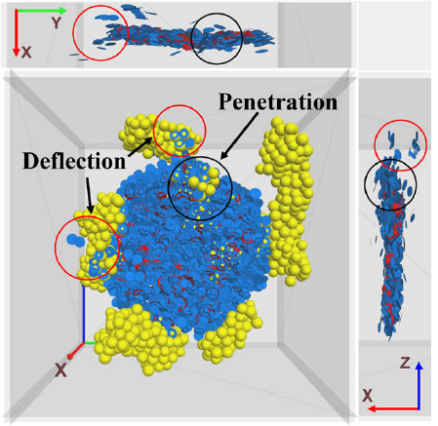 基于Voronoi網絡結構的三維DEM礫巖數字模型與流固耦合壓裂算法相結合能實現精準的裂縫擴展過程計算。圖3為礫巖壓裂模擬結果與實驗結果對比圖,兩者均體現了穿礫及繞礫兩種遇礫擴展模式。