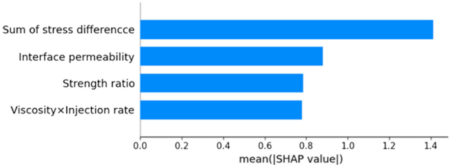 此外,SHAP可對所有輸入特征的貢獻值進行綜合分析,計算每個特征的平均SHAP值并獲取宏觀貢獻值。如圖5所示,地應力差值對預測結果的影響程度最高。