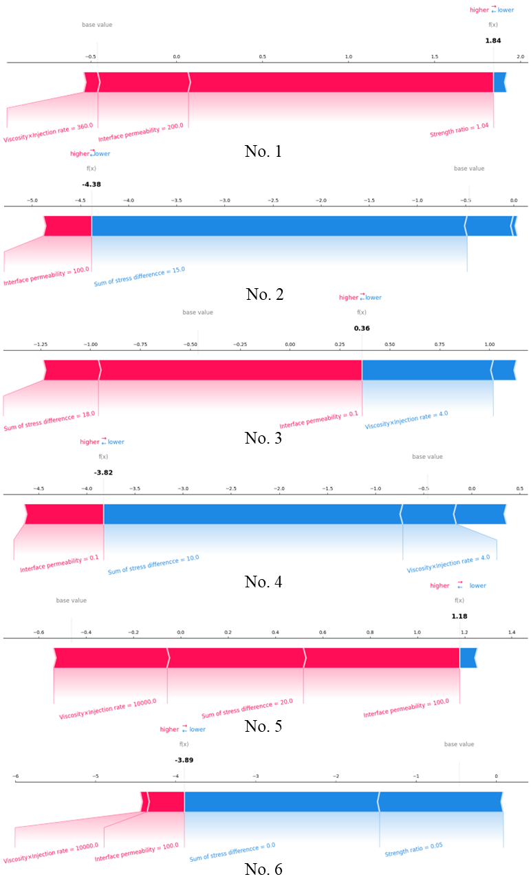 利用XGBoost-SHAP可解釋機器學習框架,可實現對單獨案例的裂縫形態預測及結果解釋,并生成特征對抗圖以輔助理解。本文從參考文獻中選取了6組案例,并將相應特征值輸入預訓練的XGBoost生成預測結果,如表2所示,可看出XGBoost對6組案例均做出了正確預測。進一步地,利用SHAP對每個案例的預測結果進行解釋并生成特征對抗圖,如圖6所示。圖中f(x)為所有輸入特征的累計貢獻值,當f(x)高于基準值(base value)時,代表預測結果為穿礫,反之當f(x)低于基準值(base value)時,代表預測結果為繞礫。特征顏色為紅色時表示其有利于穿礫,為藍色時表示其有利于繞礫,且特征條長度體現其貢獻程度。