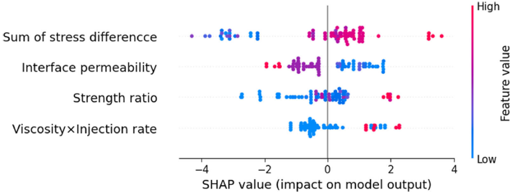 在XGBoost完成預測后,采用SHAP對預測結果進行解釋。圖4展示了訓練集數據的SHAP值,其中Feature value表示相應特征的輸入值,SHAP值為正的特征值有利于穿礫,而SHAP值為負的特征值有利于繞礫,可看出較高的界面滲透率和強度差會促進裂縫遇礫偏轉,而較高的地應力差、粘度和排量會促進穿礫。