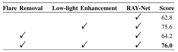 4. 在使用RAY-Net完成檢測任務之前使用完整的DCRE模型同時進行低光增強和耀斑消除。