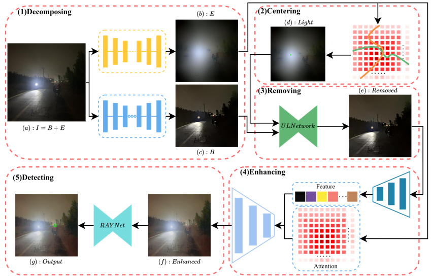 圖1. DCRE模型的結構。(1)表示圖層分解模塊,用于將輸入圖像(a)分解為光效層(b)和背景層(c)。(2)表示高斯擬合模塊,用于定位圖像的光源中心,(d)中的綠點表示擬合結果。(3)表示消除反射耀斑模塊,該模塊基于光源中心和光學中心對稱先驗信息對背景層(c)中的反射耀斑進行定位和消除。(4)表示低光增強模塊,該模塊使用光效層(b)作為注意力圖,引導模型對去除反射耀斑后的結果(e)的低光區域進行增強,得到增強圖像(f)。(5)表示最終的檢測模塊,本文使用RAY-Net完成檢測任務,得到檢測結果(g)。