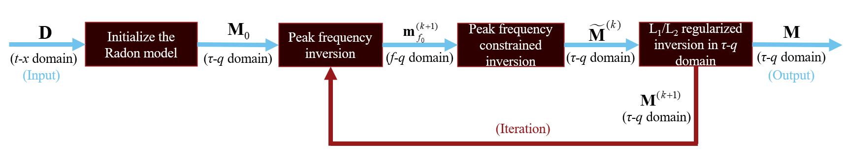 其中,在頻率-偏移距(f-x)域中,d表示地震數據的時間-偏移距(t-x)域頻率分量;而在頻率-曲率(f-q)域中,m表示Radon域(τ-q域)模型,L是隨頻率變換的Radon變換正演模型算子,是非正交的。